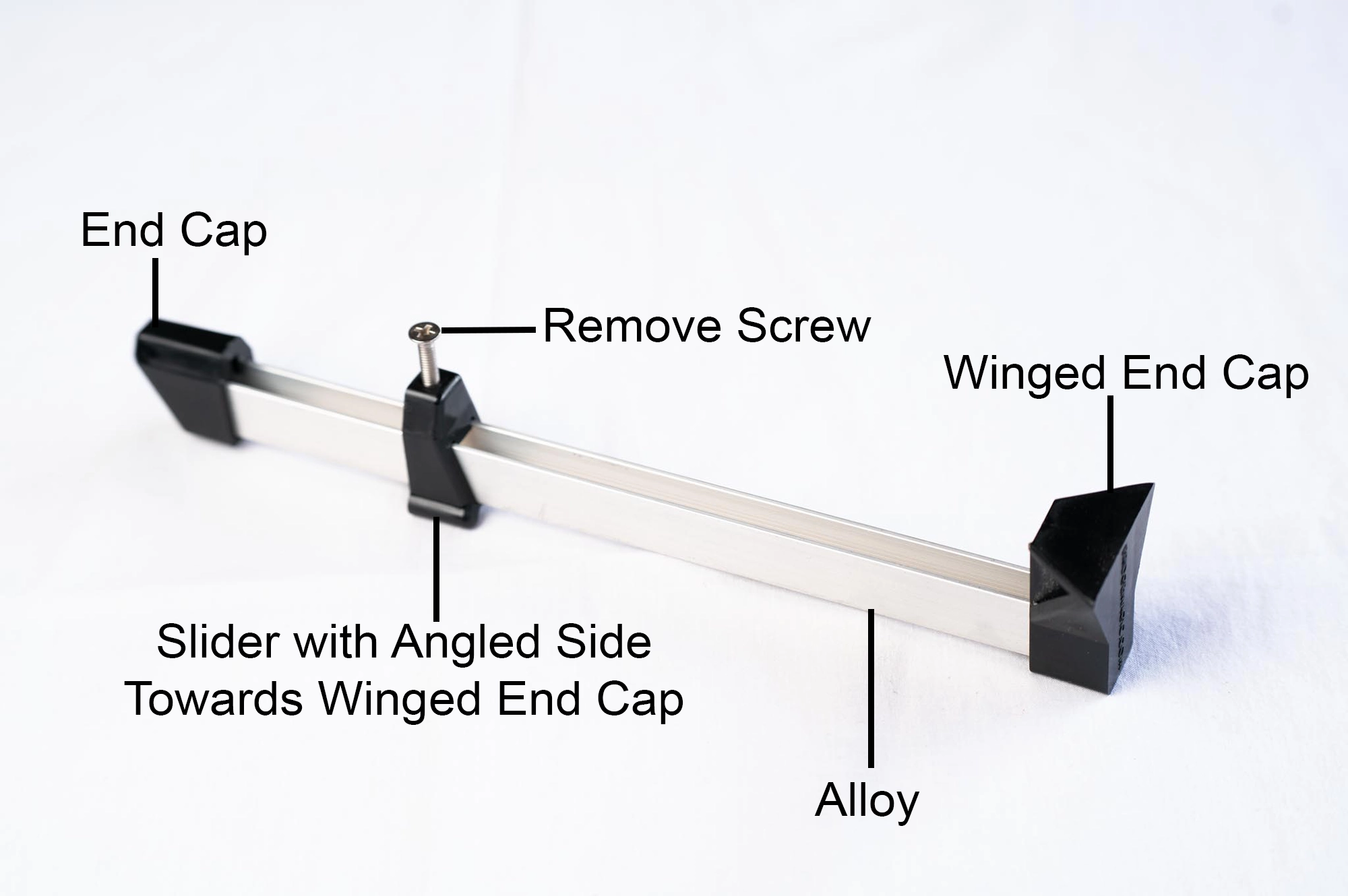 Cut the square end of the alloy (not the angled end) to this measured length and assemble BridgeMagic©. Push the slider onto the alloy, and slot on both plastic ends as pictured.