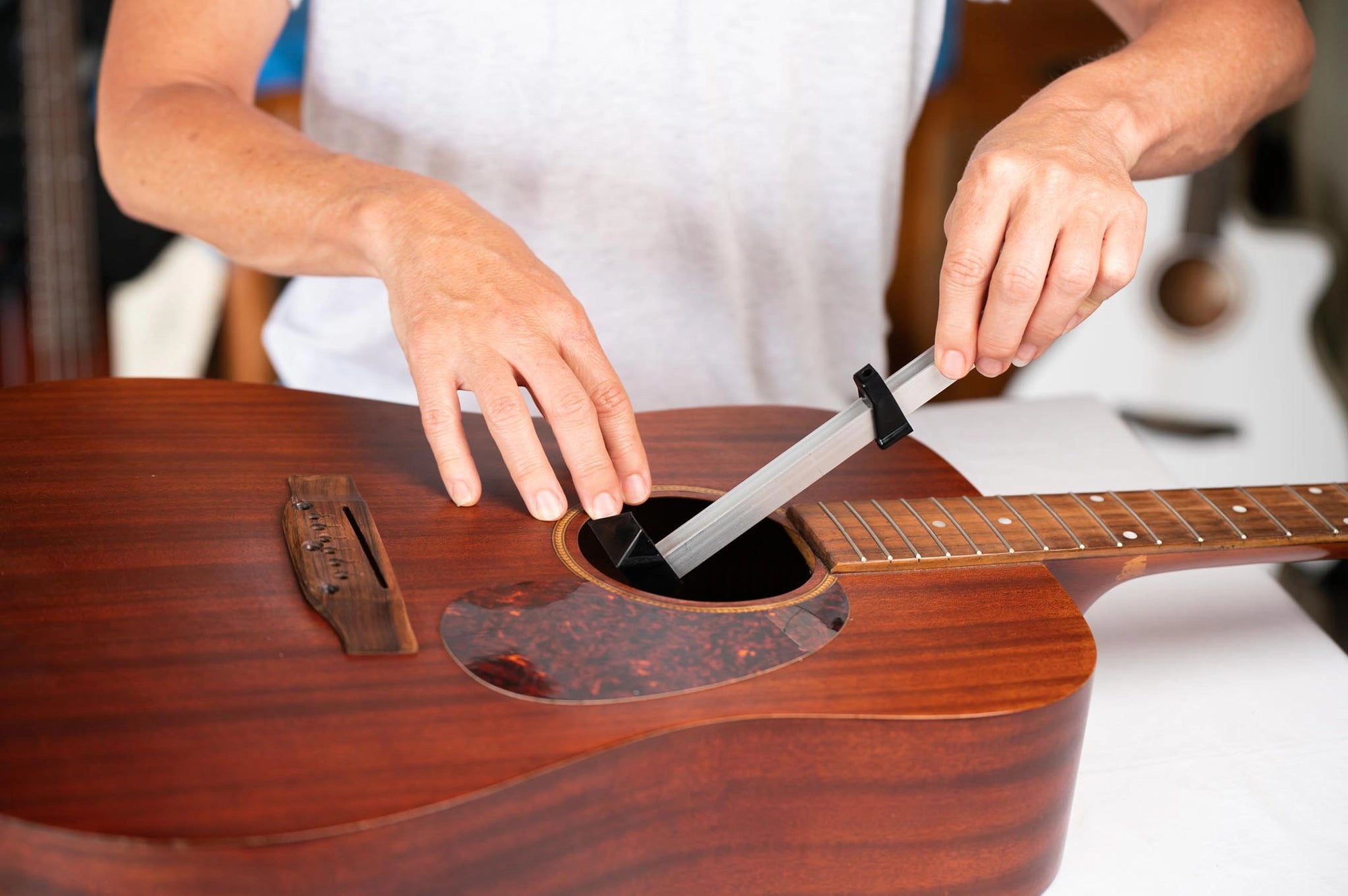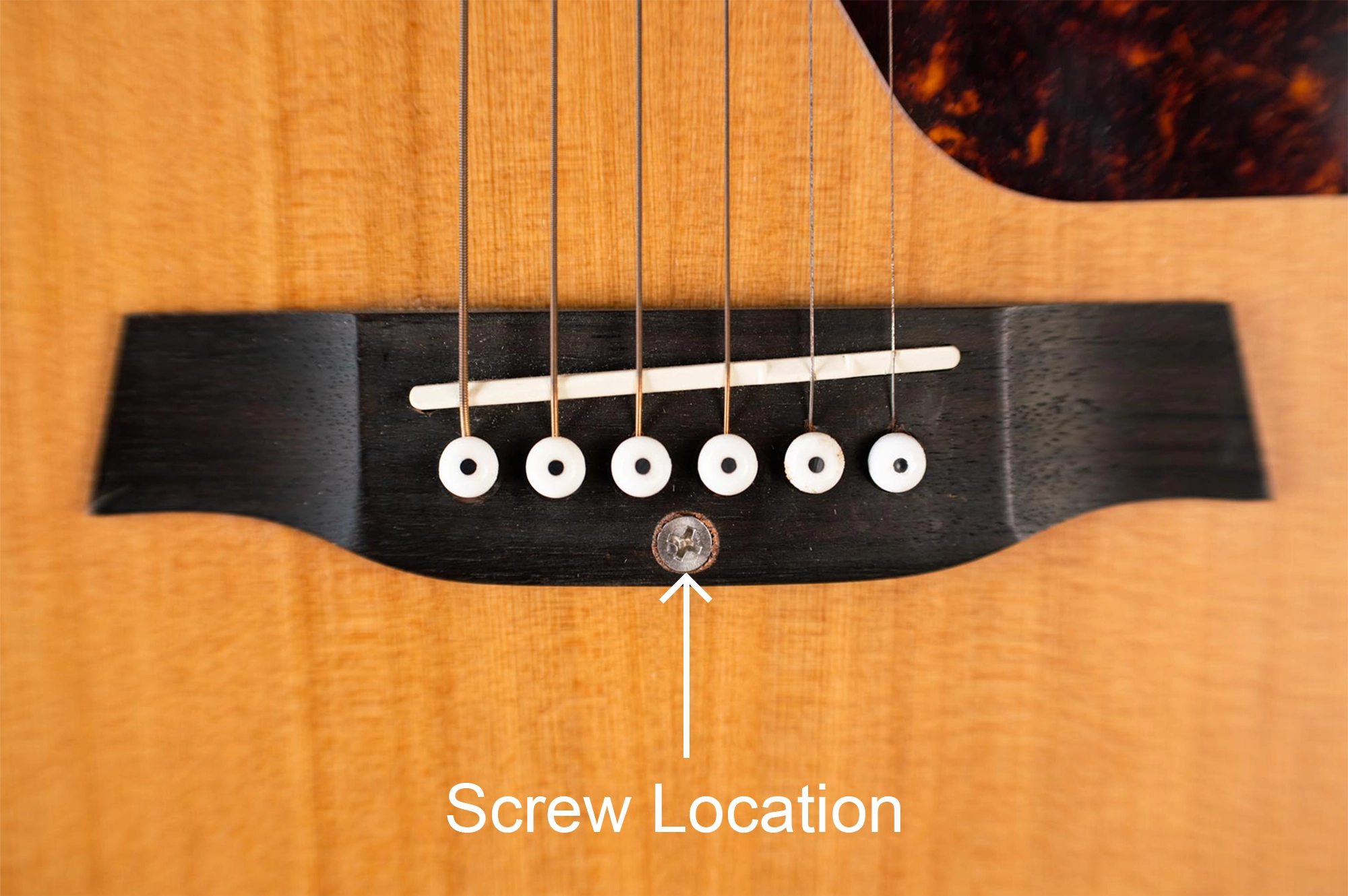 Slip BridgeMagic© into the guitar through the sound hole, place the screw into the pre-drilled bridge hole and thread it into the nut at the top of the nylon slider.