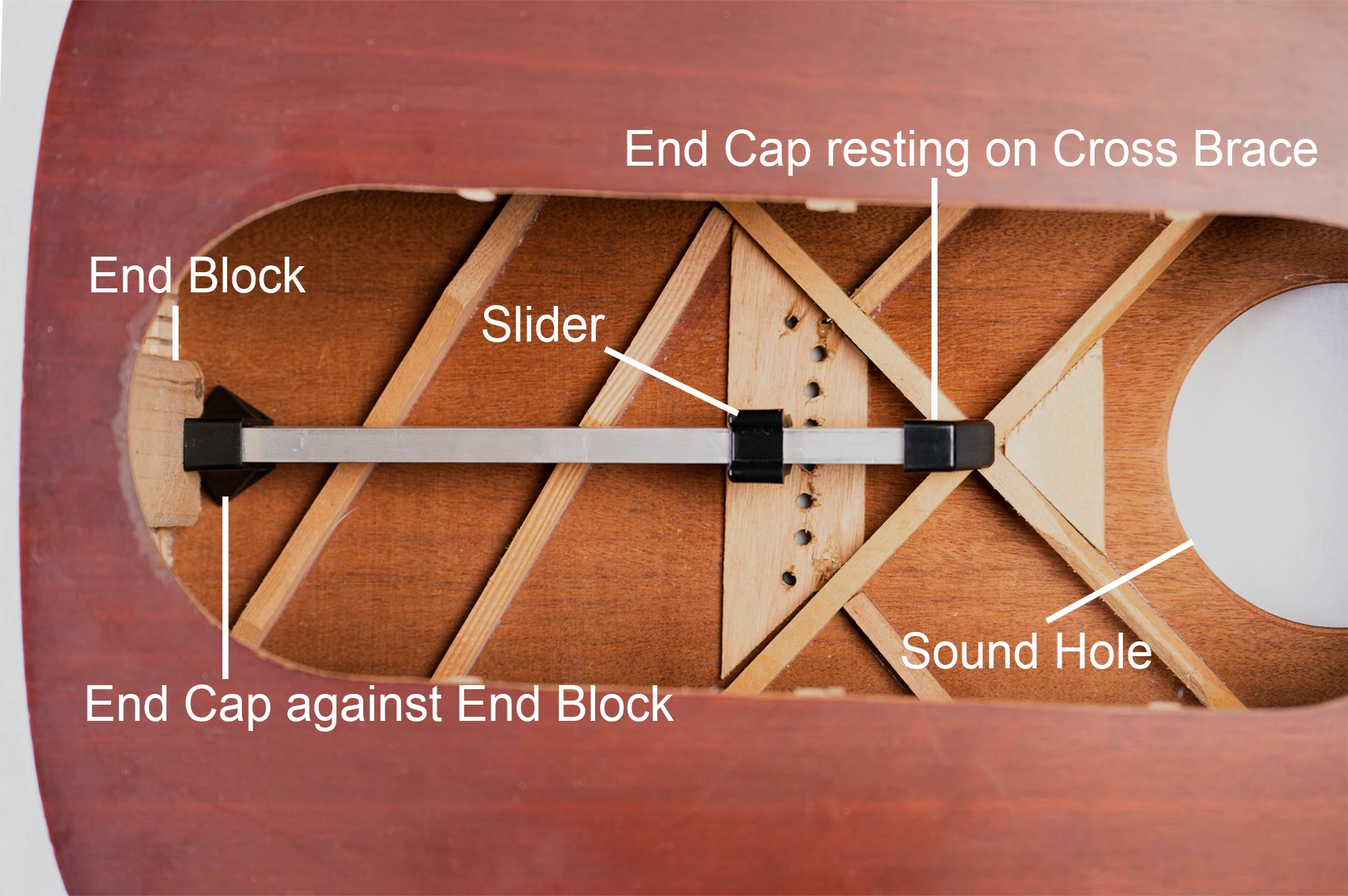 Ensure BridgeMagic© is positioned correctly inside the guitar, with the nylon end cap centred under the cross brace. Tighten the screw to hold BridgeMagic© in place.